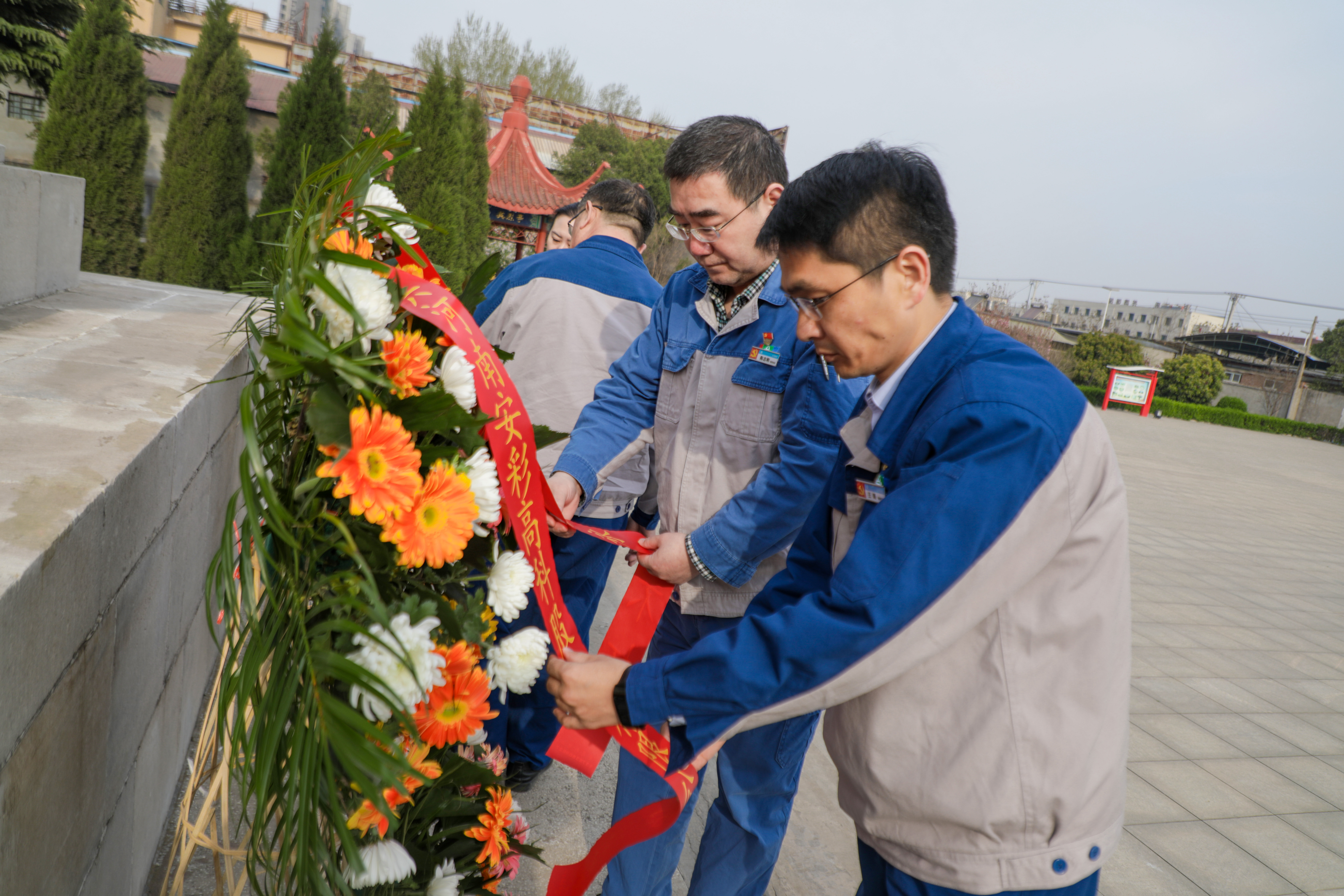 由安彩高科全體干部職工敬獻的花籃,紅底緞帶上的“革命先烈永垂不朽”金色大字,格外醒目,熠熠生輝。公司領導緩步來到紀念碑前,駐足凝視,代表全體職工整理花籃緞帶。